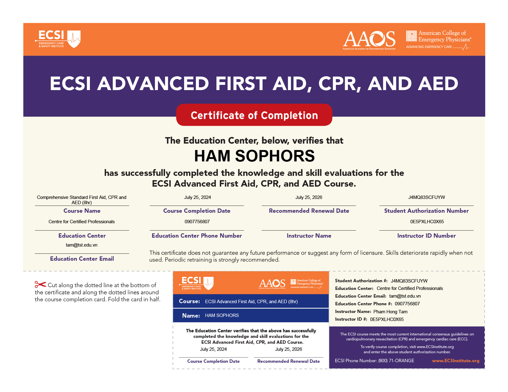 Học viên tham gia và hoàn thành thành công phần thi thực hành và thi viết, sẽ được cấp chứng chỉ Sơ cấp cứu Nâng cao, CPR và AED, được uỷ quyền bởi Tổ chức chăm sóc cấp cứu và an toàn (ECSI) của Hoa Kỳ.